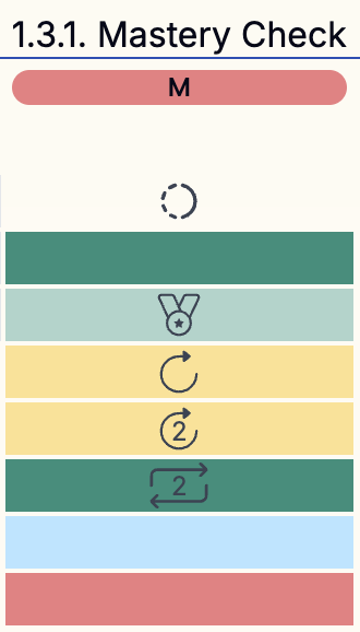 - green, with redo icon & number - The student has mastered this activity after multiple submissions.